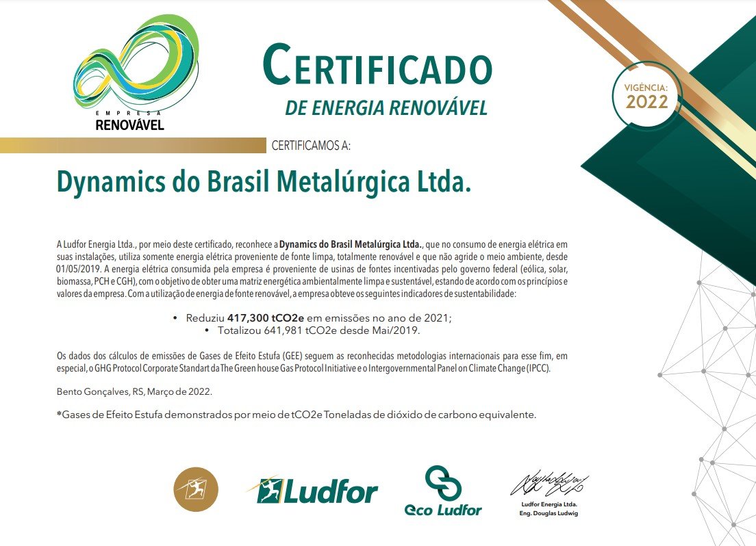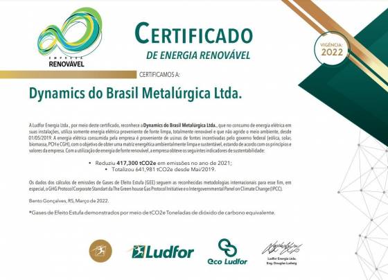 Continuando con la labor de captación de energía verde para su área de producción, Dynamics recibió un año más el Certificado de Energías Renovables, siendo reconocida como Empresa Renovable, lo que garantiza que en el consumo de energía eléctrica en sus instalaciones utiliza únicamente energía eléctrica proveniente de un fuente limpia, totalmente renovable que no daña el medio ambiente.