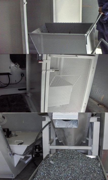 Os cavacos são inseridos na máquina trituradora e carregados à centrífuga através de um canal transportador. O óleo recuperado da centrífuga é estocado em um reservatório de coleta. Deste modo, o óleo contido nos cavacos é recuperado e reutilizado nas máquinas.
